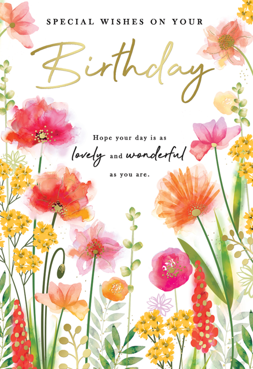Wish her happy birthday with this birthday card for her. This general birthday card for her features a beautiful floral design. Inside this birthday card for her is a full colour insert. This greeting card features a hot foil finish and is designed and printed in the UK.