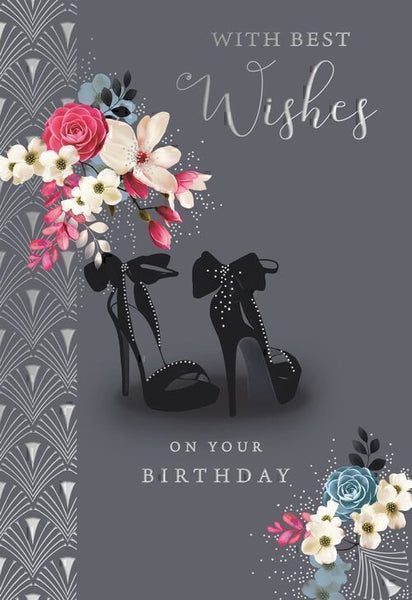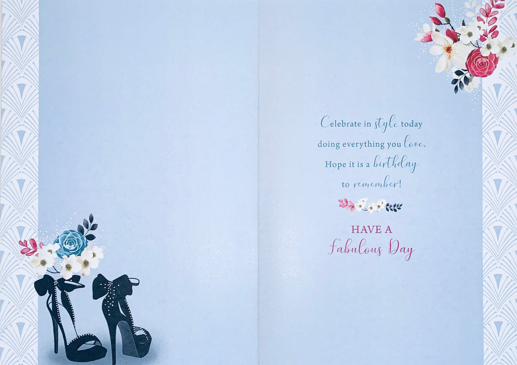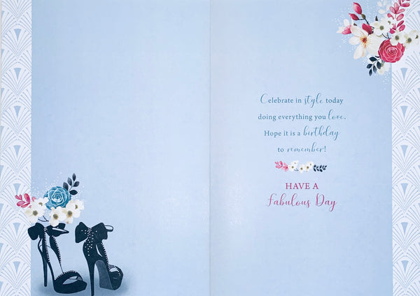 Wish her happy birthday with this chic birthday card for her. This general birthday card for her features a beautiful birthday shoes and flowers design. Inside this birthday card for her is a full colour insert. This greeting card features an eye catching silver foil finish and is designed and printed in the UK.