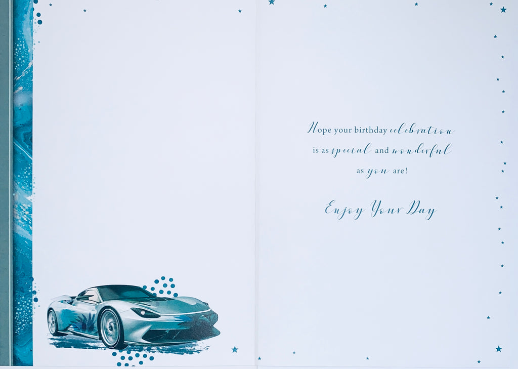 Wish them happy birthday with this traditional birthday card for a car enthusiast! This super car inspired birthday card features a full colour insert and a sparkling silver foil finish adds a touch of shine to make it extra special.