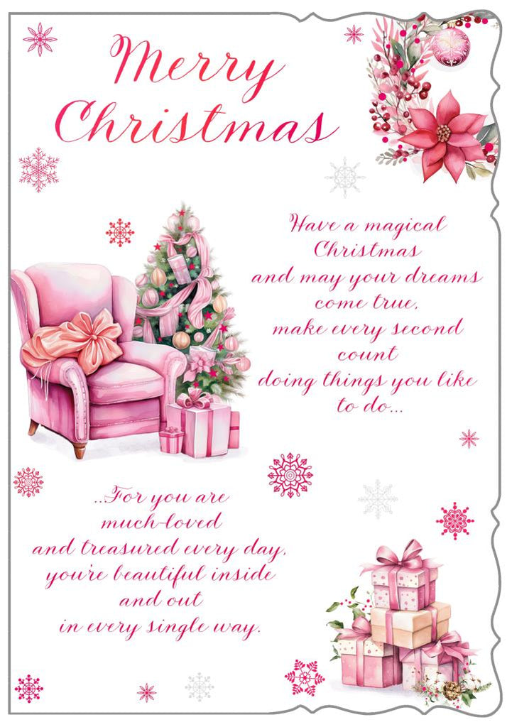 Verse reads: Have a magical Christmas and may all your dreams come true. Make every second count doing all the things you like to do. For you are much loved and treasured every day. You’re beautiful inside and out in every single way. Have the best Christmas you could ever wish for. With love.