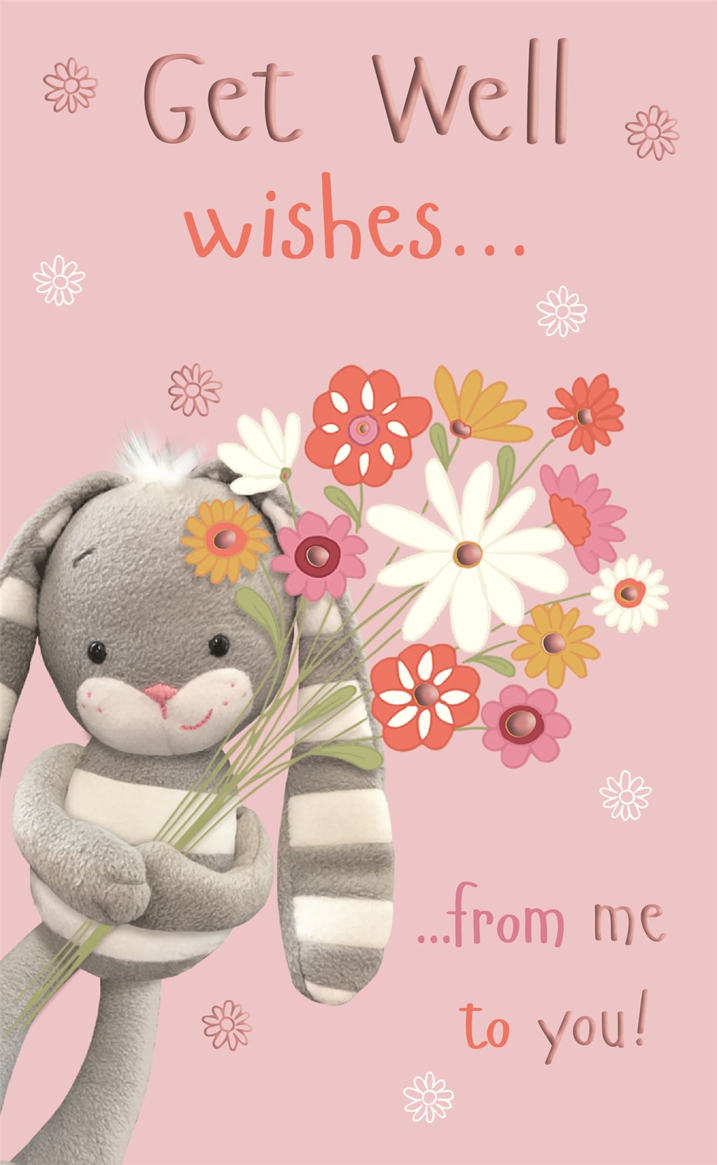 Share some warmth and support whilst they aren’t feeling well by sending this very cute get well card. This cute get well card features a very cute rabbit holding a bouquet of flowers. This cute design is sure to bring a smile and let them know you care and are thinking of them. This greeting card is designed and printed in the UK on high quality board sourced from environmentally responsible resources.