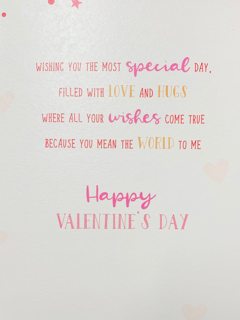 Verse reads: Wishing you the most special day, filled with love and hugs where all your wishes come true, because you mean the world to me. Happy Valentine’s Day.