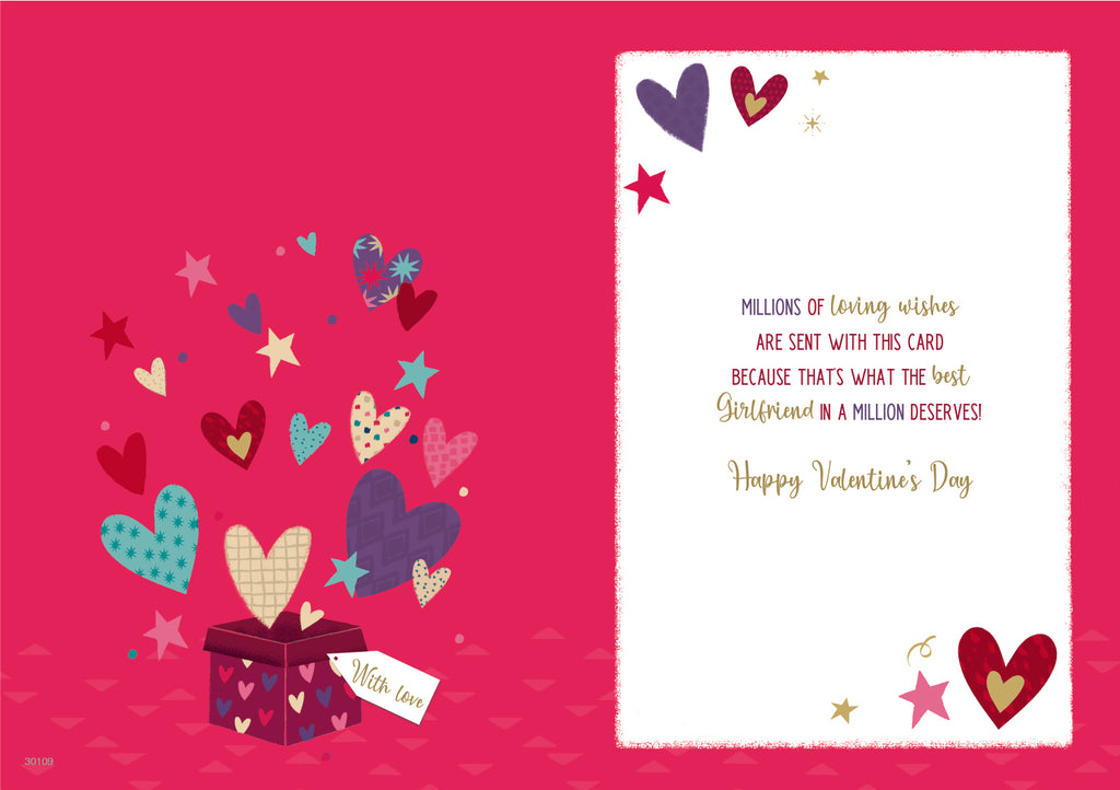 Verse reads: Millions of loving wishes are sent with this card because that’s what the best girlfriend in a million deserves! Happy Valentine’s Day