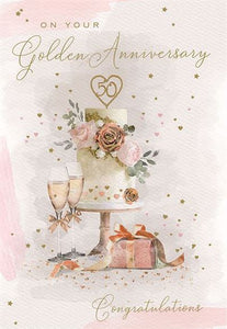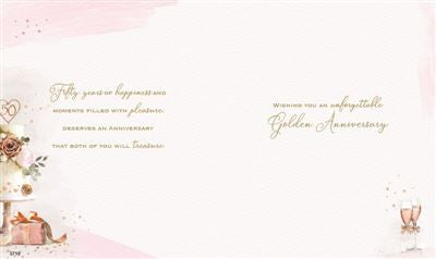 Send your heartfelt congratulations on their very special wedding anniversary with this golden anniversary card. This golden wedding anniversary card features a beautiful cake and champagne design. This greeting card is printed on high quality board with hot foil and glitter finish. This golden wedding anniversary card has a full colour insert.