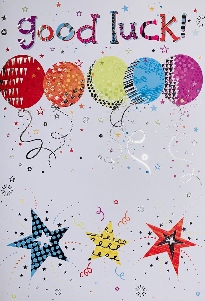 Wish them luck with this modern good luck card. Bright colourful text with a silver foil finish and colourful stars. Short verse.