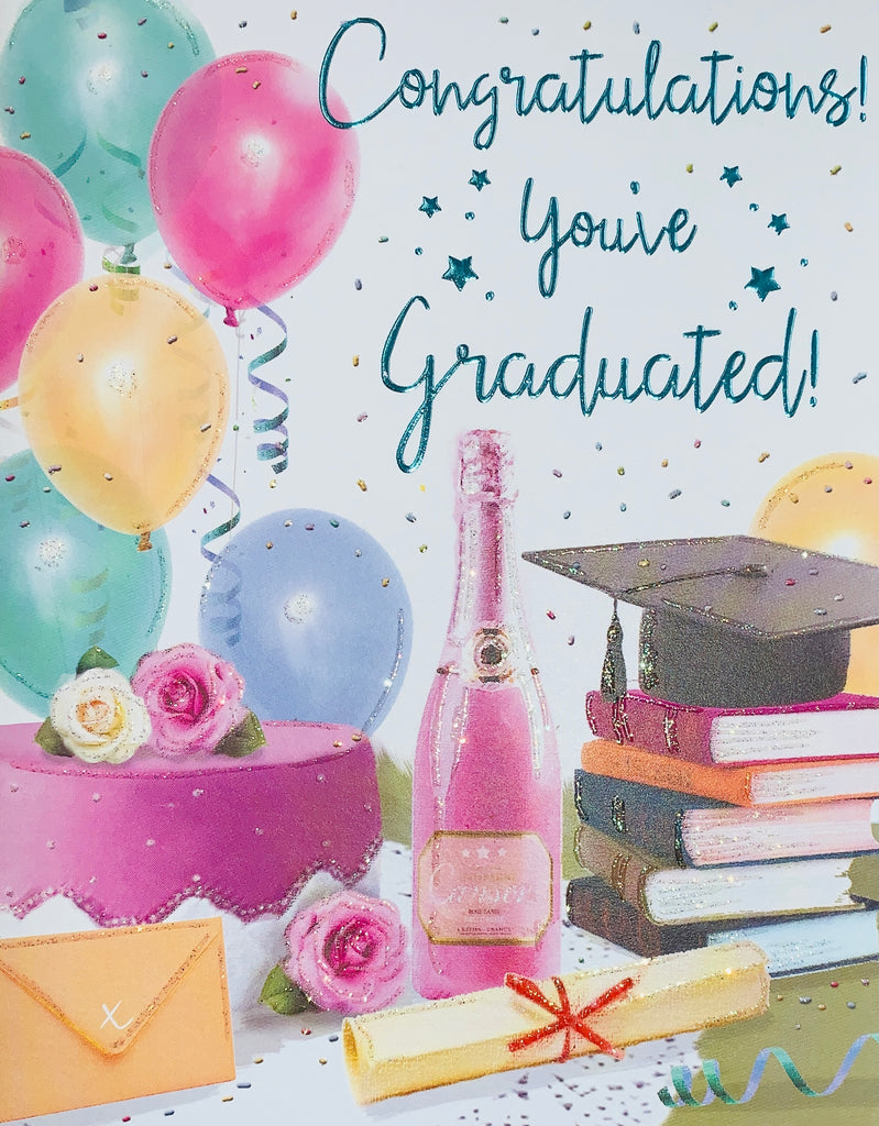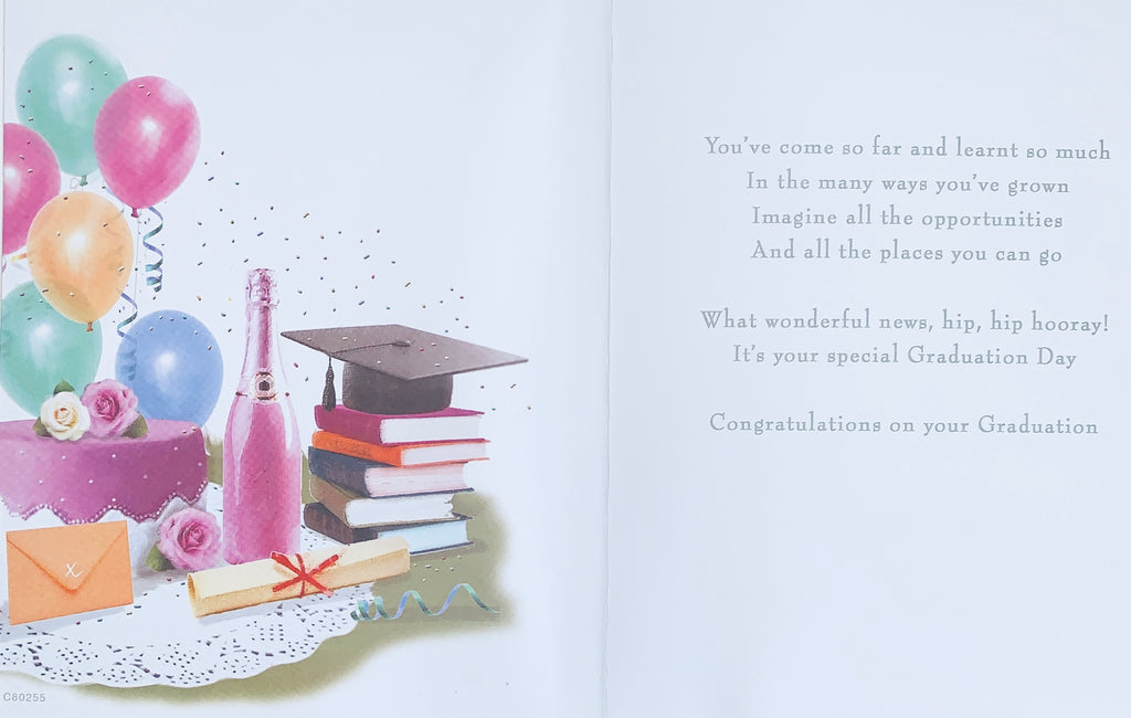 Congratulate them on their wonderful achievement with this traditional Graduation card. This traditional Graduation card features a traditional design with a hot foil and glitter finish. This graduation card is designed and printed in the UK. This greeting card has a full full insert with a medium length verse.