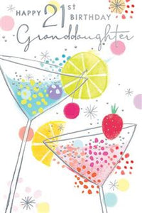 Celebrate your Granddaughter’s 21st birthday with this contemporary Granddaughter 21st birthday card. Let your Granddaughter know how special she is on her 21st birthday with this lovely Granddaughter 21st birthday card. This Granddaughter 21st birthday card features a contemporary cocktail design with a hot foil finish with a full colour insert. This Granddaughter 21st birthday card is produced in the UK.