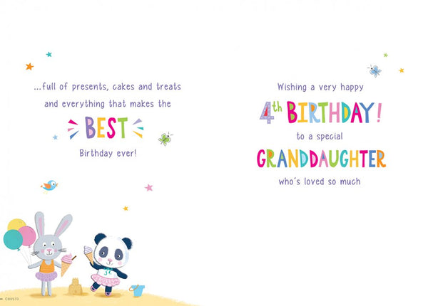 Celebrate your Granddaughter’s 4th birthday with this cute Granddaughter age 4 birthday card. This Granddaughter 4th birthday card features a cute design with a full colour insert. This Granddaughter 4th birthday card is produced in England.