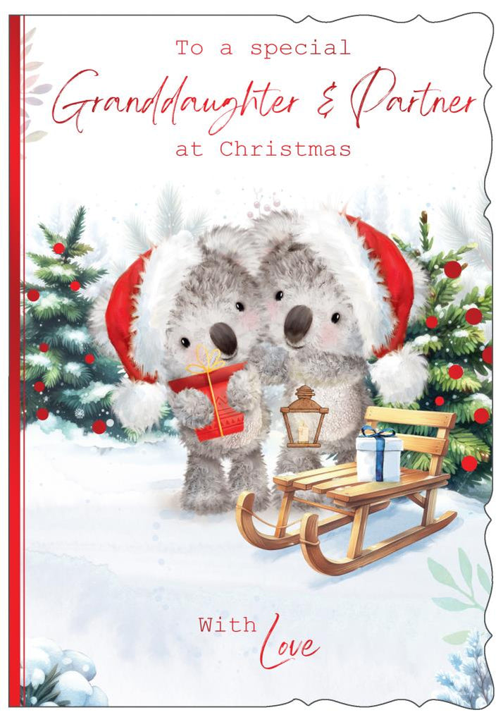 Wish your Granddaughter and her Partner a wonderful Christmas and let them know they are being thought about with this cute Granddaughter and Partner Christmas card. This cute Granddaughter and Partner Christmas card features a cute Xmas bears design. This Granddaughter and Partner Christmas card has a red foil finish and full colour print inside. This greeting card is designed in the UK.