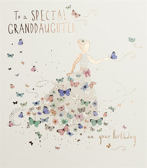 Send birthday wishes to your fantastic granddaughter with this beautiful granddaughter birthday card. This beautiful granddaughter birthday card features a stunning dress and butterfly design. This greeting card is printed on high quality board with bright hot foil finish.