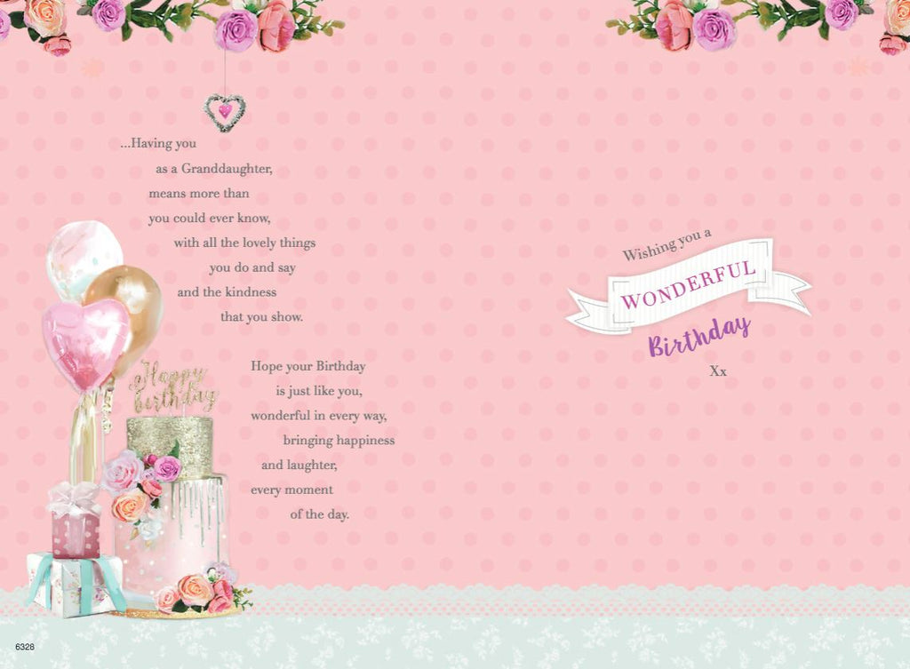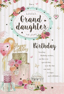 Let your Granddaughter know how wonderful she is with this lovely Granddaughter birthday card. This granddaughter birthday card has a lovely birthday cake design. This granddaughter birthday card is printed on high quality board with a lovely gold foil and glitter finish. This Granddaughter birthday card is designed and printed in the UK. Inside this greeting card is a full colour insert.