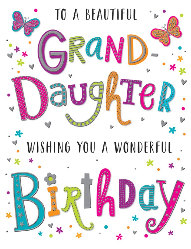 Send your love and birthday wishes to your wonderful granddaughter with this granddaughter birthday card. This birthday card for granddaughter features a colourful contemporary design with a hot foil finish and full colour print inside. Bright bold colours.