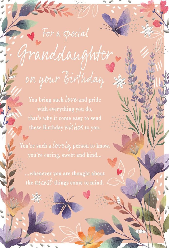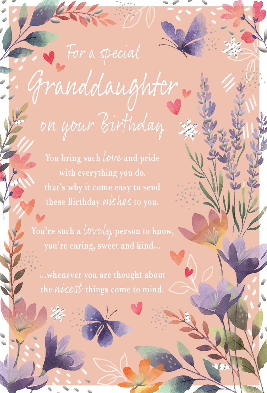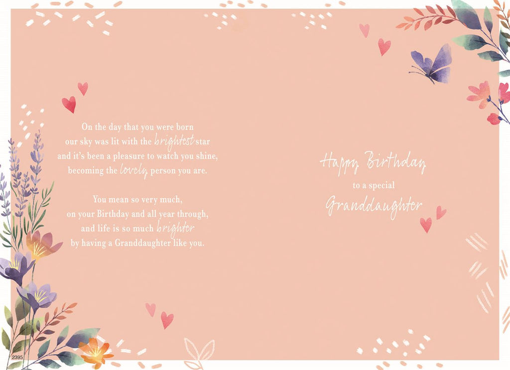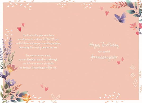 Let your Granddaughter know how wonderful she is with this lovely Granddaughter birthday card. This granddaughter birthday card has a lovely floral design. This granddaughter birthday card is printed on high quality board with a lovely gold foil finish and full colour insert with a long sentimental tree to express your love. This Granddaughter birthday card is designed and printed in the UK on board sourced from environmentally responsible resources