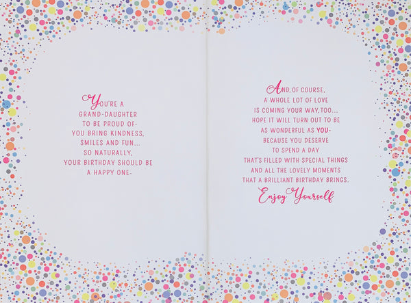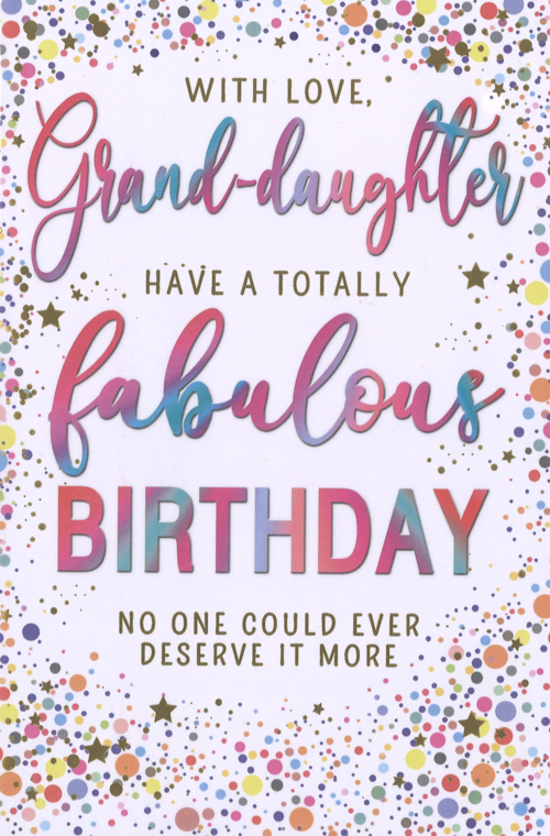 Celebrate your Granddaughter’s birthday with this beautiful granddaughter birthday card. With a colourful confetti design and shiny golden foil finish, this card features a vibrant full-colour print insert with a long sentimental verse to send your heartfelt wishes to your special granddaughter.