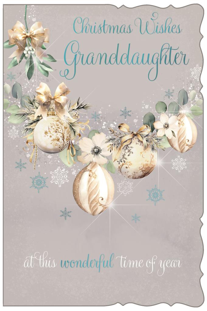 Wish your granddaughter a very merry Christmas with this festive granddaughter Christmas card. This traditional granddaughter Christmas card features a classic Christmas baubles design. This granddaughter Christmas card has a turquoise foil finish, and a full colour insert. This greeting card is designed in the UK.