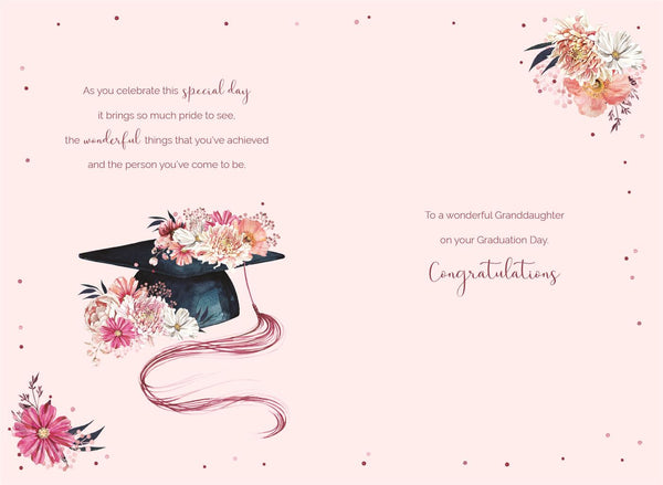 Congratulate your Granddaughter on her graduation. Let your Granddaughter know how amazing she is with this lovely Granddaughter Graduation card. Tell your Granddaughter how proud you are of her with this lovely Granddaughter Graduation card. This Granddaughter Graduation card has a lovely traditional design with a medium length verse. This Granddaughter Graduation card is printed on high quality board with a hot foil finish and is designed and printed in the UK. Inside this Granddaughter graduation greeting card is a full colour insert.