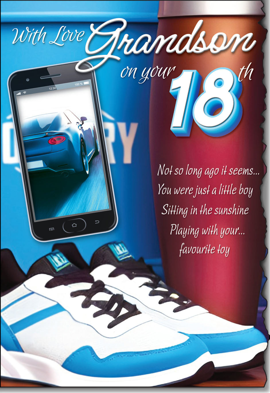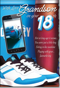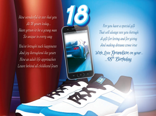 Send your Grandson the perfect birthday greeting with this Grandson 18th birthday card. Adorned with a printed photographic design with trainers and mobile phone themes, this card is printed on high-quality board with a glitter finish and full colour insert plus a long verse. Manufactured in the UK, this unique birthday card is sure to make the day extra special.