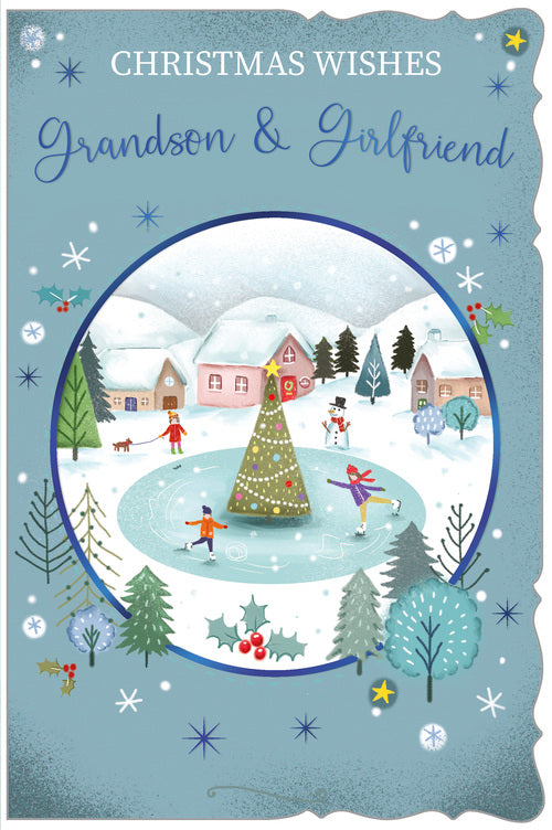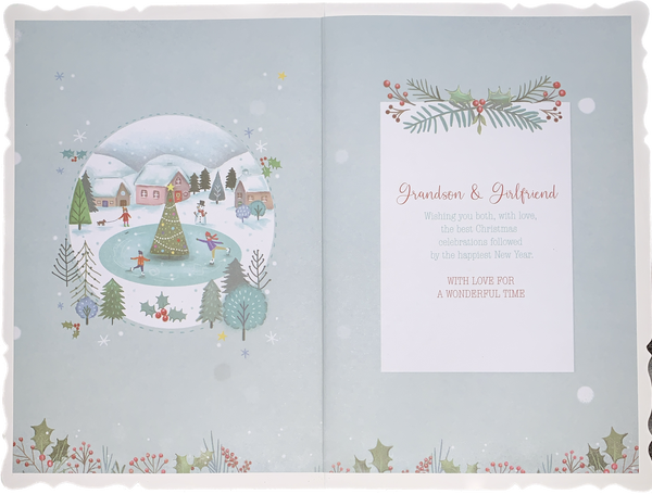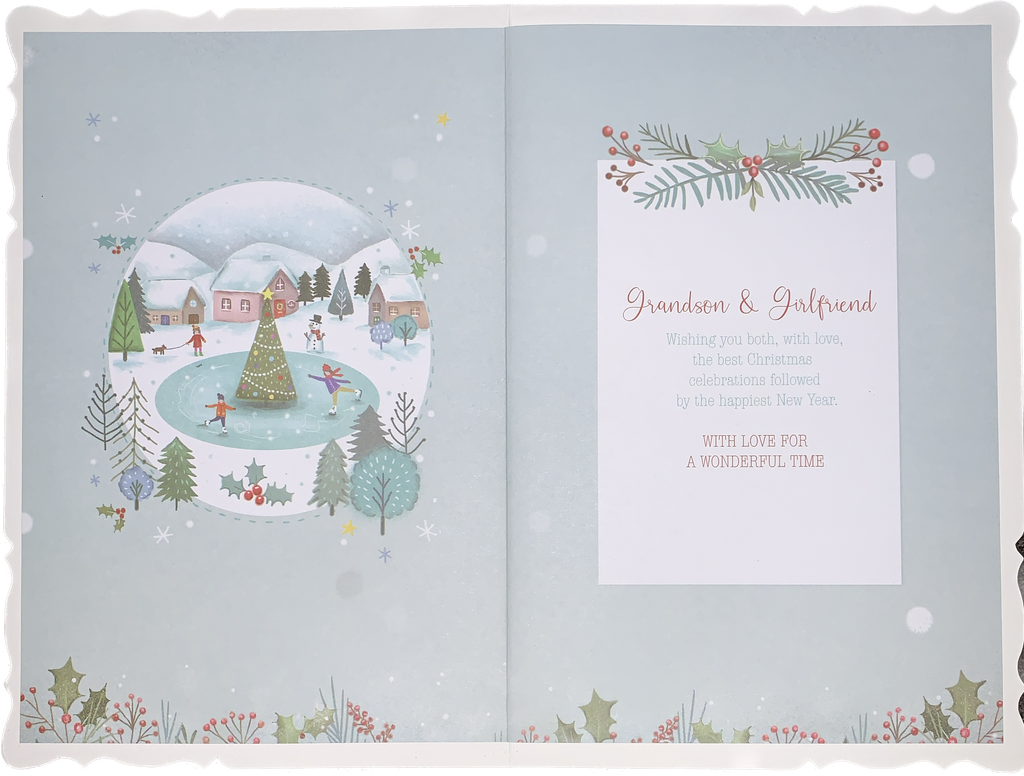 Share your loving wishes for Grandson and his girlfriend this festive season with this precious Grandson and Girlfriend Christmas card! An enchanting ice skating design graces the card, glimmering with a dazzling blue foil finish, and a full colour insert. This perfect card is sure to make their Christmas extra special!