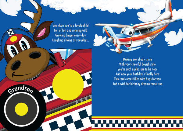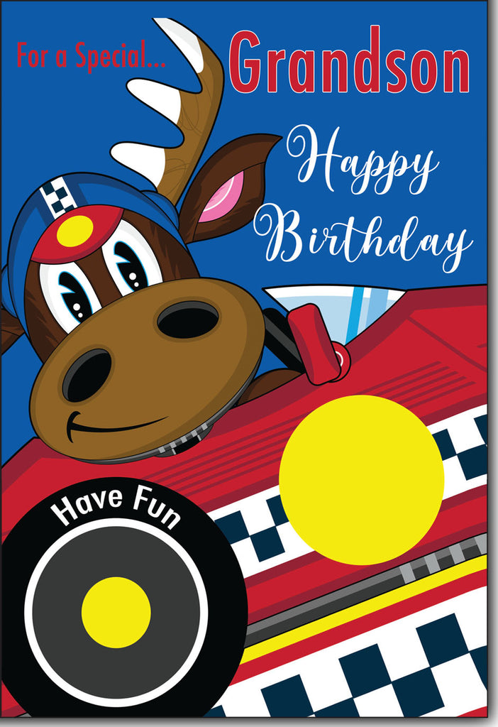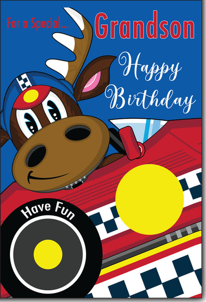 Send the happiest of birthday wishes to your grandson on his birthday with this very cute Grandson birthday card. This Grandson birthday card has a cute racing car and moose design and is printed on high quality board with a glitter finish and full colour print inside. This greeting card is designed and printed in the UK on high quality board and sports vibrant colours to make this wonderful card stand out.