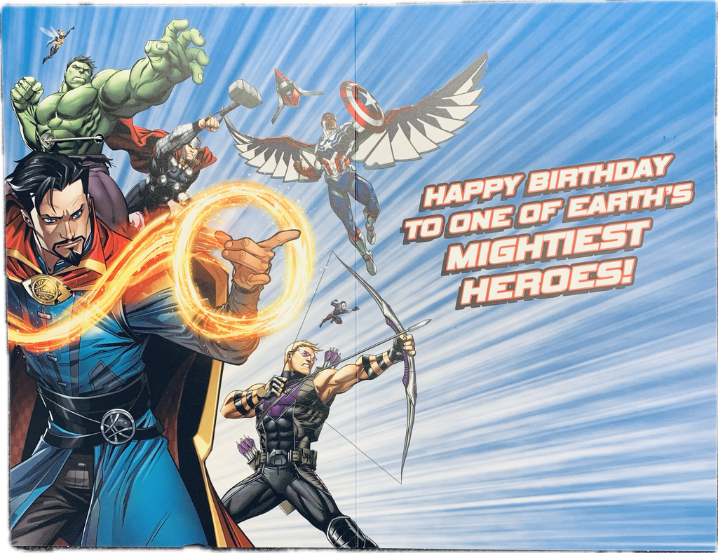 Send your Grandson a birthday wish fit for a superhero! This Marvel Avengers Grandson birthday card features an adventure packed Marvel Avengers and comes with a Marvel Avengers badge attachment to make their celebration extra special. Make their day with a truly action-packed birthday!