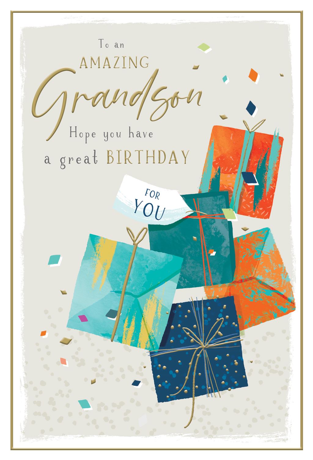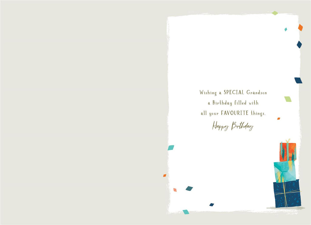 Send happy birthday wishes to your grandson with this bright and bold Grandson birthday card. This contemporary Grandson birthday card features a colourful design. This greeting card is printed on high quality board with a gold foil finish. This birthday card for Grandson has a full colour insert and is designed and printed in the UK and produced from environmentally responsible resources.