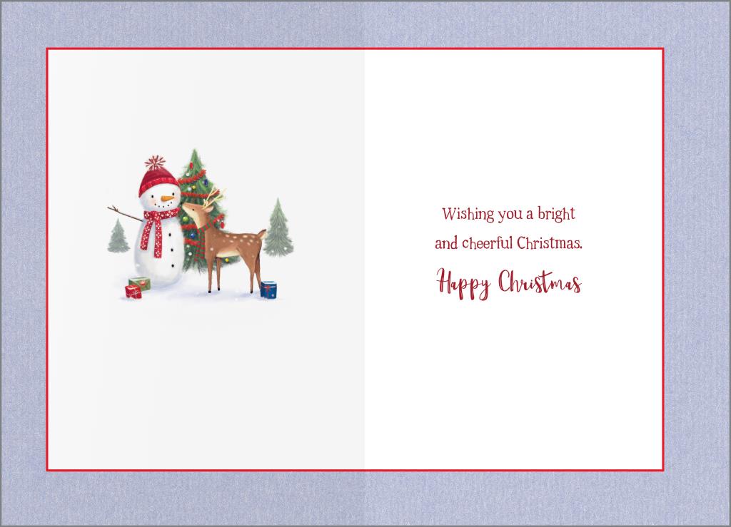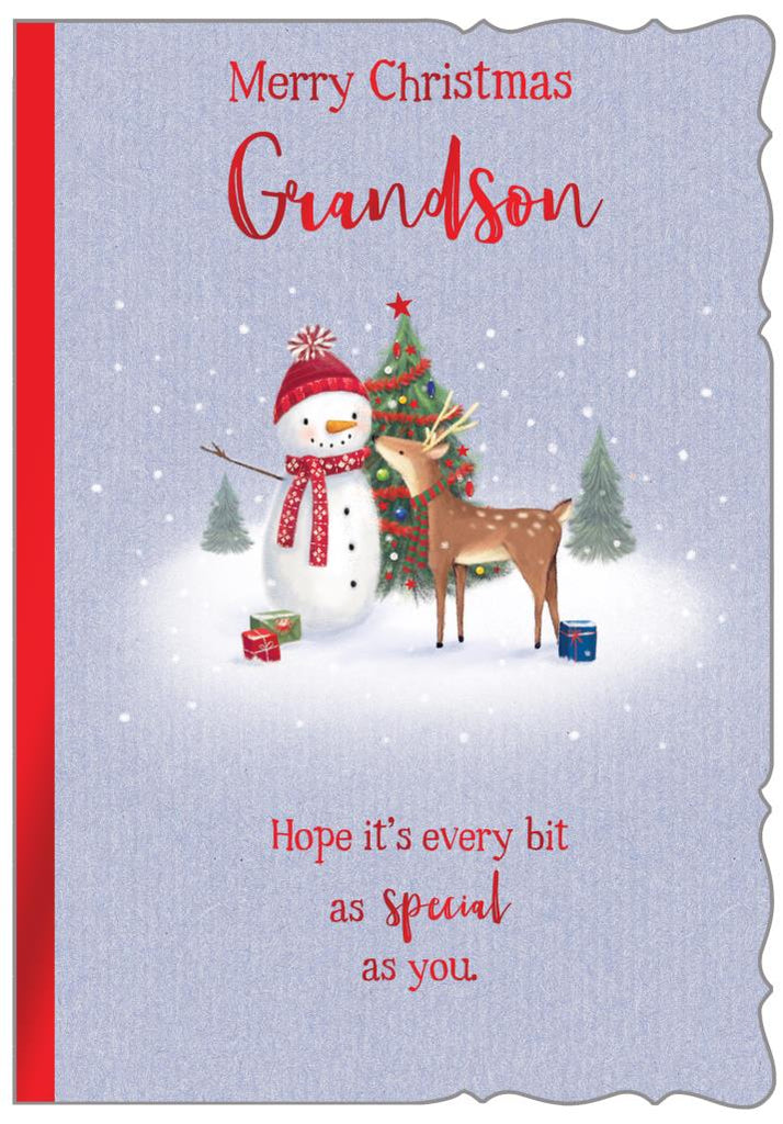 Send your Grandson a fabulous Christmas cheer wit’s this adorable Grandson card! This festive design is printed with red foil to make a fun and jolly snowman and reindeer. Pop it open to reveal a vibrant full colour interior!