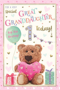 Wish your Great-Granddaughter a wonderful first birthday with this Great-Granddaughter 1st birthday card. This Great Granddaughter 1st birthday card features a cute bear design. This greeting card is printed on high quality board with a hot foil finish and full colour print inside. Medium length verse. This Great-Granddaughter 1st birthday card is designed and printed in the UK.