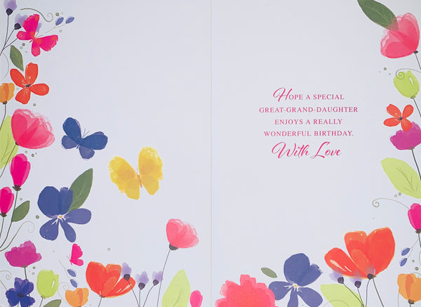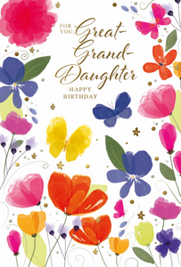 Celebrate your Great Granddaughter’s birthday with this Great-Granddaughter birthday card. This Great Granddaughter birthday card features a colourful flowers and butterfly design and has a golden foil finish. This Great-Granddaughter birthday card has full colour print inside.