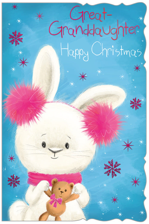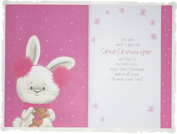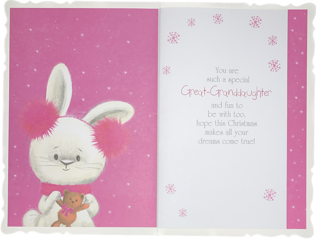 Wish your precious Great-Granddaughter merry Christmas with this very cute Great Granddaughter Christmas card. This enchanting card features a cuddly Christmas bear that brings a smile to all who see it. A golden foil finish and full colour insert complete this adorable card.