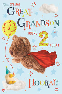 Send the most amazing and fantastic greetings to your great-grandson on his 2nd birthday. Show him how super he is with this cute bear-themed superhero card, printed with sparkly hot-foil on premium board and featuring a full-colour surprise inside!