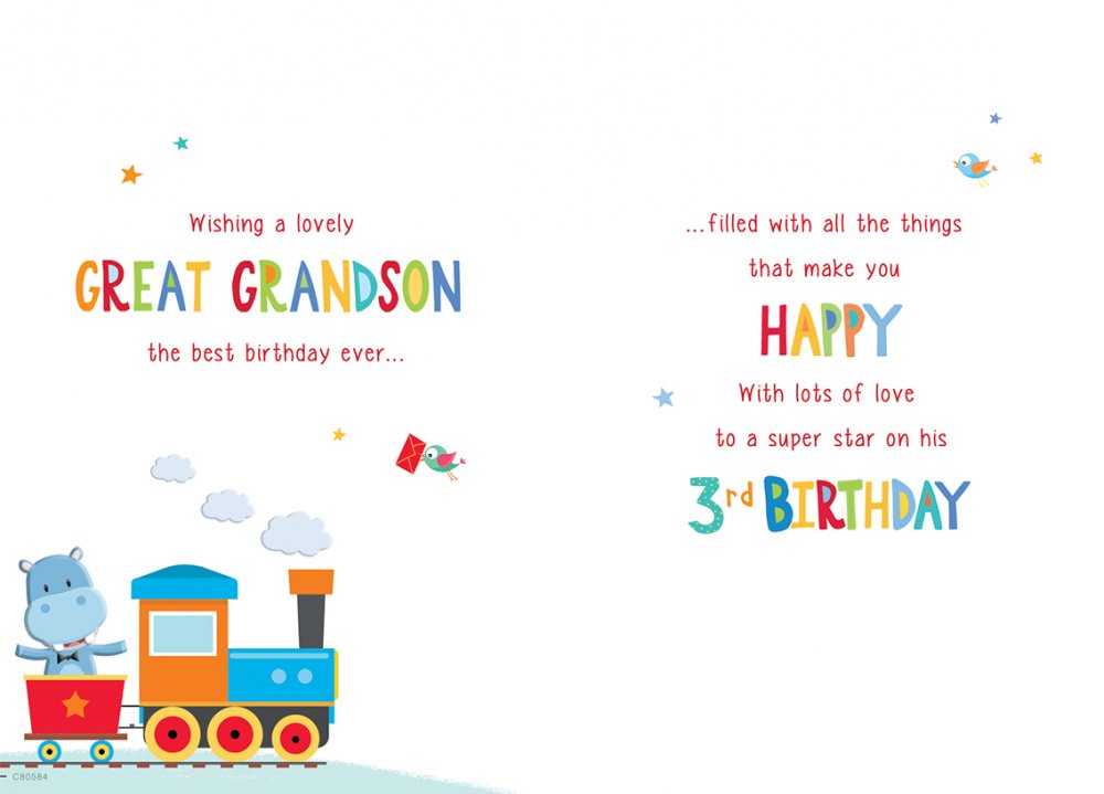 Celebrate your Great-Grandson’s 3rd birthday with this cute Great Grandson age 3 birthday card. This Great Grandson 3rd birthday card features a cute design with a full colour insert. This Great-Grandson 3rd birthday card is produced in England.