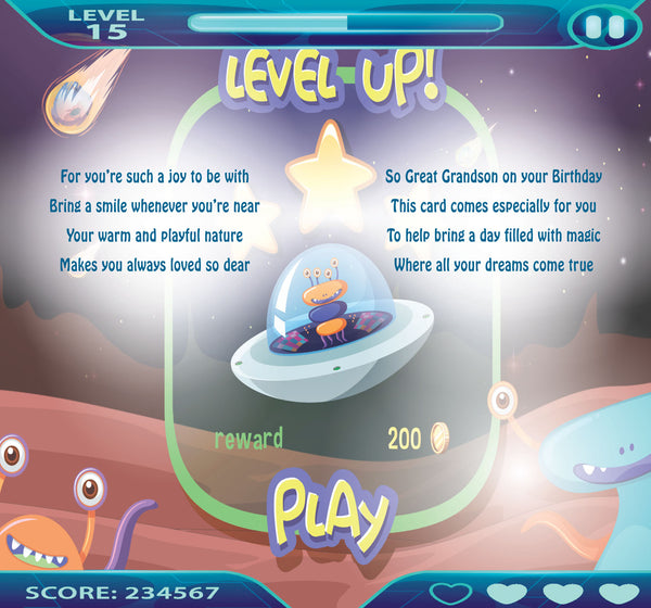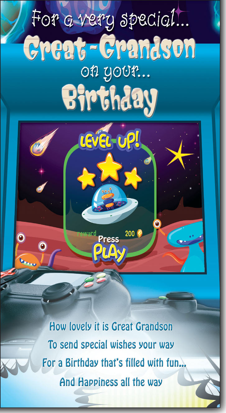 Send fun happy birthday wishes to your great grandson with this colourful great grandson birthday card. This great grandson birthday card is printed on high quality board with glitter finish and bright colourful picture. Full colour insert. Long verse.
