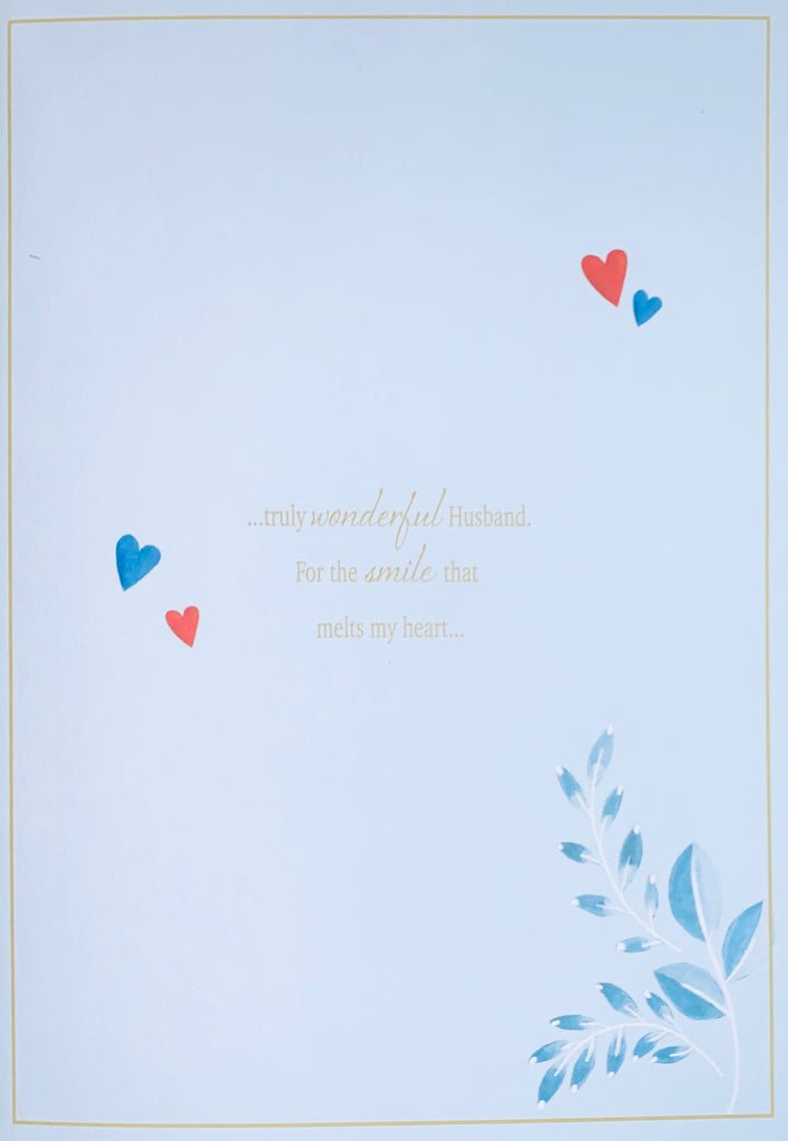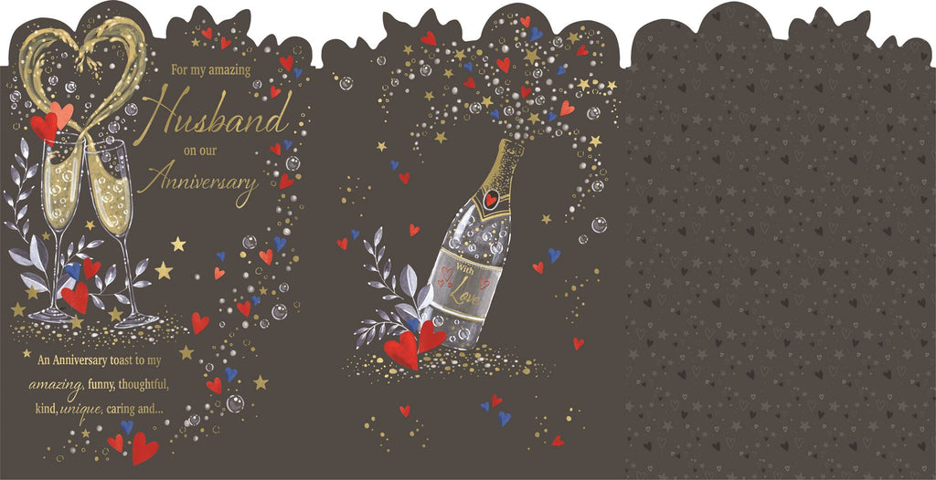 Send loving anniversary wishes to your wonderful husband and let him know how special he is with this beautiful wedding anniversary card for husband. This large husband anniversary card features a beautiful champagne and love hearts design with a luxurious gold and red foil finish. This greeting card is printed on high quality board and has a multi page full colour insert with a long verse. This greeting card has long beautiful worded verse to tell your husband how loved he is.