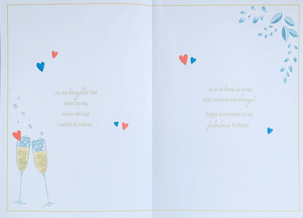 Verse reads : AN Anniversary toast to my AMAZING, funny, thoughtful, kind, UNIQUE, caring and truly WONDERFUL Husband For the SMILE that melts my heart, for the LAUGHTER that makes my day and for the hugs I couldn't be without... ...all of me LOVES all of you, today, tomorrow and ALWAYS! Happy Anniversary to my FABULOUS Husband!