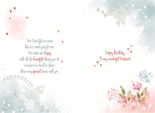 Verse inside reads: Your hand fits in mine like it's made just for me You make me happy with all the heartfelt things you do, it means so much to share these very special times with you. Happy Birthday to my wonderful husband
