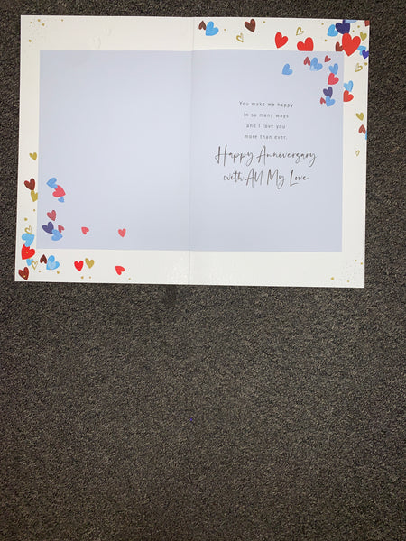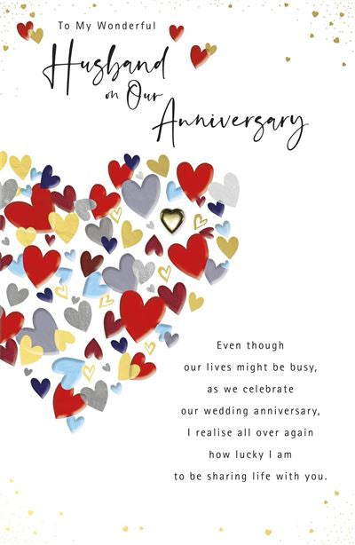 Mark your special day in style with this modern Husband wedding anniversary card. Crafted with a bright gold and silver foil finish and a decorative small heart adornment, its quality board gives it an elegant look and feel. Designed in the UK, this Husband wedding anniversary card also includes a full-colour insert. Wish your Husband a memorable anniversary.