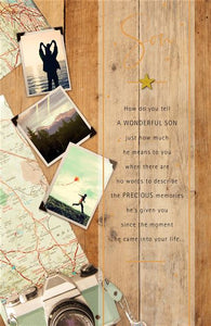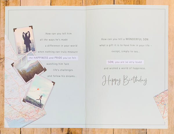 Send your Son a heartfelt birthday wish with this beautiful Son card! Featuring a hot foil finish and decorative detail, this card has a full color insert with a loving verse. From letting your Son know how proud you are of the man he's become to telling him how special he is, this card's thoughtful words are sure to make him smile.