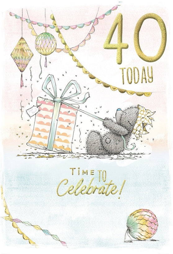 Cute me to you 40th birthday card. Wish them a wonderful birthday 40th birthday with this lovely Me to you 40th birthday card. This lovely Me to you 40th birthday card features tatty teddy with a golden foil finish printed on high quality board. Full colour print inside. Printed on card sourced from environmentally responsible sources.
