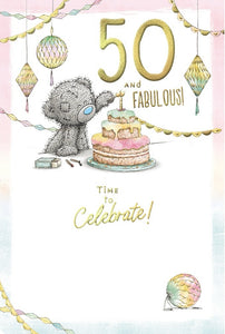 Cute me to you 50th birthday card. Wish them a wonderful fiftieth birthday with this lovely Me to you 50th birthday card. Cute Me to you bear enjoying lighting birthday cake candles. This lovely Me to you 50th birthday card features tatty teddy with a golden foil finish printed on high quality board. Full colour print inside. Printed on card sourced from environmentally responsible sources.