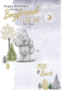 Cute me to you Boyfriend birthday card. Wish your Boyfriend a wonderful birthday with this lovely Me to you Boyfriend birthday card. Cute Me to you bears cuddling. This lovely Me to you Boyfriend birthday card features tatty teddy with a golden foil finish printed on high quality board. Full colour print inside. Printed on card sourced from environmentally responsible sources.