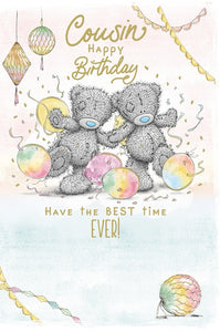 Cute me to you Cousin birthday card. Wish your Cousin happy birthday with this lovely Me to you Cousin birthday card. This card features Cute Me to you bears partying. This lovely Me to you Cousin birthday card has an eye catching golden foil finish and is printed on high quality board. Full colour print inside.