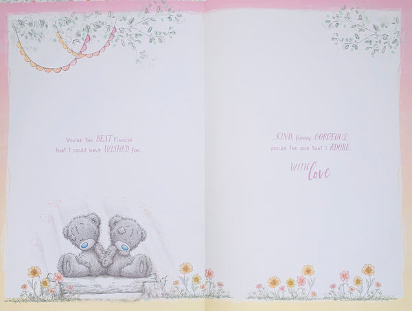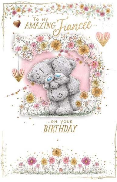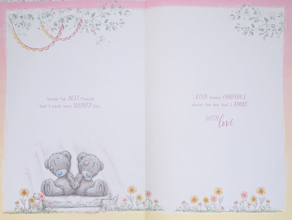 This high-quality, luxury Me to you Fiancée birthday card showcases two adorable tatty teddy bears. Send your birthday wishes to your Fiancée with this elegant and luxurious card, featuring a beautiful rose gold foil finish and multiple decorative attachments. The full-colour printed insert adds an extra special touch.