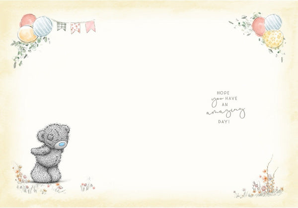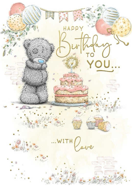 Send big birthday wishes with this wonderful me to you birthday card to celebrate their birthday. This very cute general birthday card from me to you features the iconic grey tatty teddy with the blue nose with a giant birthday cake. This greeting card is printed on high quality board with an eye catching gold foil finish. Full colour print inside. Short verse.