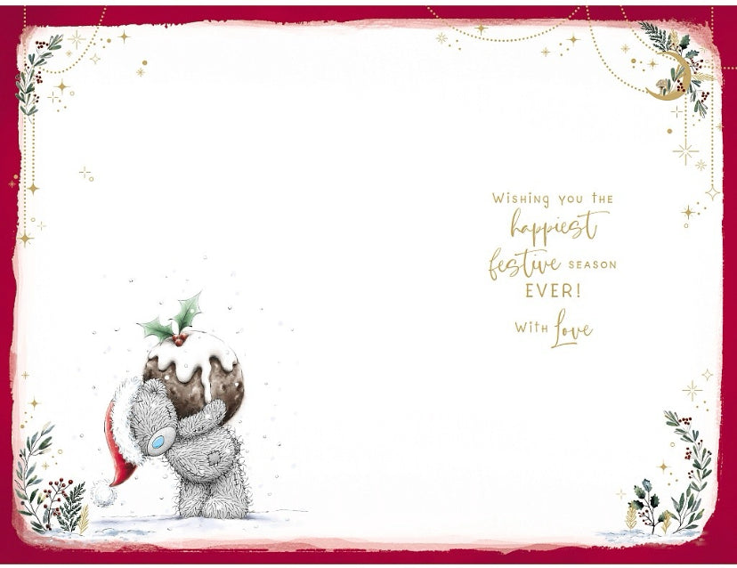 Cute me to you Great Nan Christmas card. Wish your Great-Nan a lovely Christmas with this cute Me to you Great-Nan Christmas card. This lovely Me to you Great-Nan xmas card features tatty teddy in fancy dress as a Christmas pudding. This greeting card has a golden foil finish and is printed on high quality board. Full colour print inside.