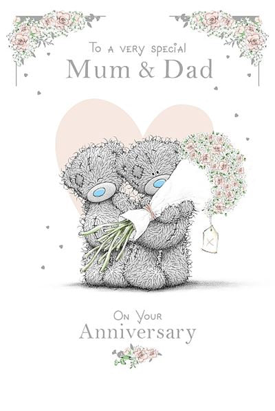 Cute me to you Mum and Dad anniversary card. Congratulate your Mum and Dad with this lovely Me to you Mum and Dad anniversary card. Me to you bears holding bouquet of flowers. This Me to you greeting card for Mum and Dad anniversary card features tatty teddy with a hot foil and glitter finish printed on high quality board. Full colour insert.