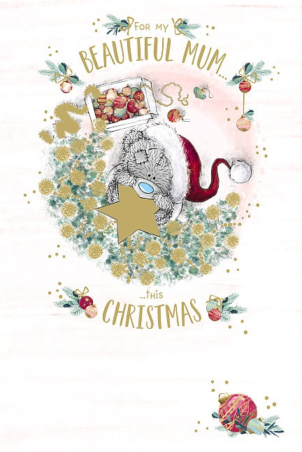 Cute me to you Mum Christmas card. Wish your Mum a wonderful Christmas with this lovely Me to you Mum Christmas card. Cute Me to you bear holding a stack of Xmas presents. This lovely Me to you Mum xmas card features tatty teddy with a golden foil finish printed on high quality board. Full colour print inside.