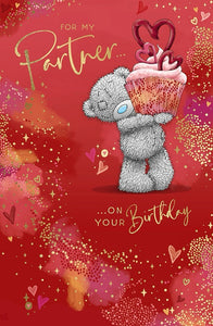 Cute me to you Partner birthday card. Wish your Partner a wonderful birthday with this lovely Me to you Partner birthday card. This Partner birthday card features a cute Me to you bear cuddling a giant cupcake. This lovely Me to you Partner birthday card features tatty teddy with a golden foil finish printed on high quality board. Full colour print inside. Printed on card sourced from environmentally responsible sources.