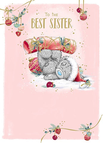 Cute me to you Sister Christmas card. Wish your Sister a brilliant Christmas with this lovely Me to you Sister Christmas card. This lovely Me to you Sister xmas card features tatty teddy with a heart of Christmas fairy lights and has a sparkling golden foil finish and is printed on high quality board. Full colour print inside.