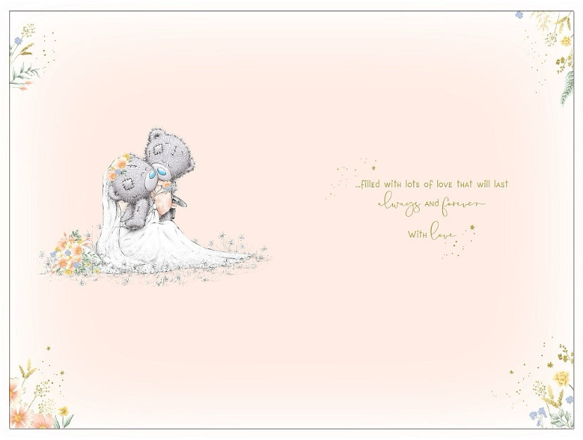 Send your congratulations with this adorable Me to You Wedding Day card. This card features the iconic Tatty Teddies bride and groom as well as a golden foil finish. It's made of high-quality board and includes a full-colour insert. Celebrate this special day in style!