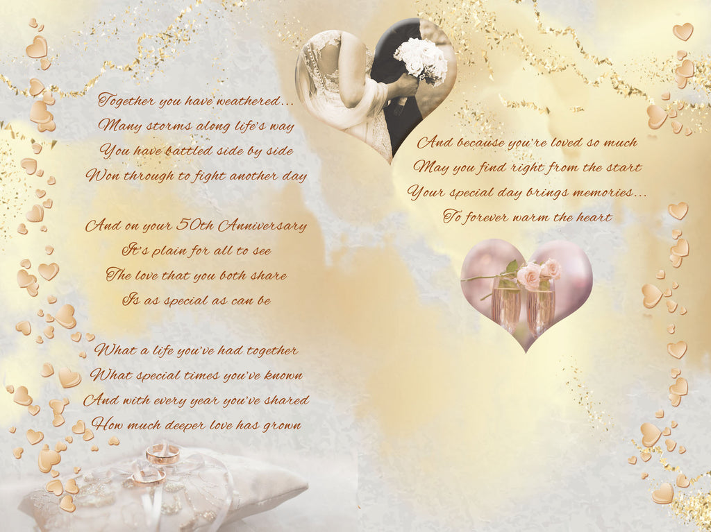 Let your Mum and Dad know how much they are loved and appreciated as they celebrate 50 years of marriage with this lovely Mum and Dad golden wedding anniversary card. This Mum and Dad golden wedding anniversary card has a lovely hearts and flowers design with a long sentimental verse. This Mum and Dad 50th anniversary card is printed on high quality board with a glitter finish and is designed and printed in the UK. Inside this Mum and Dad golden anniversary card is a full colour insert with a long sentimental verse.